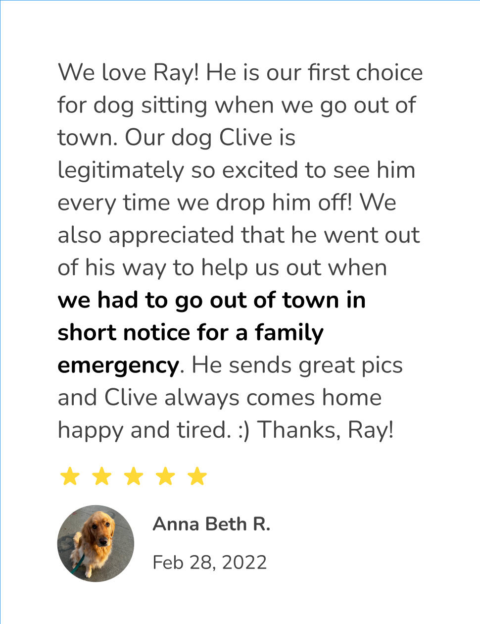 Ray took awesome care of our dog, Clive! He took him on great walks, played with him with his fave toys, sent pics of their time together, and was super with communication. Clive came home tired and happy.? We will book again! Thanks, Ray!